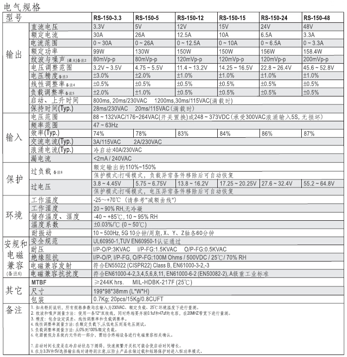 保护种类:短路/过负载/过电压;自然风冷;LED电源指示灯;100%满载老化;全部使用105°C长寿命电解电容;能承受300VAC浪涌输入5秒;工作温度高达70°C;承受5G振动测试;高效率,长寿命和高可靠性;3年保固.