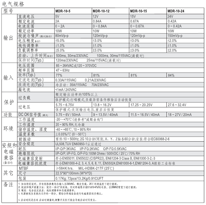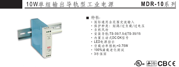 国际通用全范围交流输入;保护种类:短路/过负载/过电压;自然风冷;安装导轨:TS-35/7.5或 TS-35/15;内置主动式DCOK信号;LED电源指示;空载功率损耗:<0.75W;100%满载老化测试;3年保固.