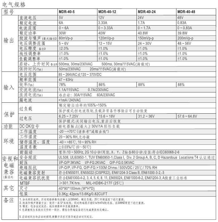 国际通用全范围交流输入;保护种类:短路/过负载/过电压;自然风冷;安装在TS-35/7.5或TS-35/15导轨上;Class I, Div 2 Hazardous Locations T4;LED电源指示灯;DCOK继电器触动;空载功率损耗:<0.75W;100%满载老化测试;3年保固.