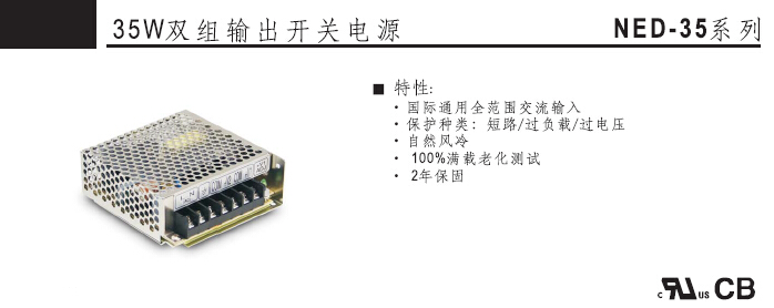 国际通用全范围交流输入 •保护种类:短路/过负载/过电压;100%满载老化测试;2年保固.