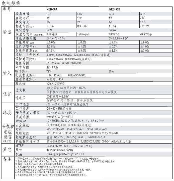 国际通用全范围交流输入;保护种类:短路/过负载/过电压;100%满载老化测试;2年保固.