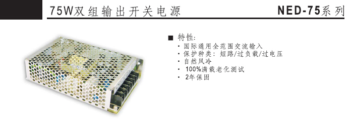 国际通用全范围交流输入;保护种类:短路/过负载/过电压;100%满载老化测试;2年保固.