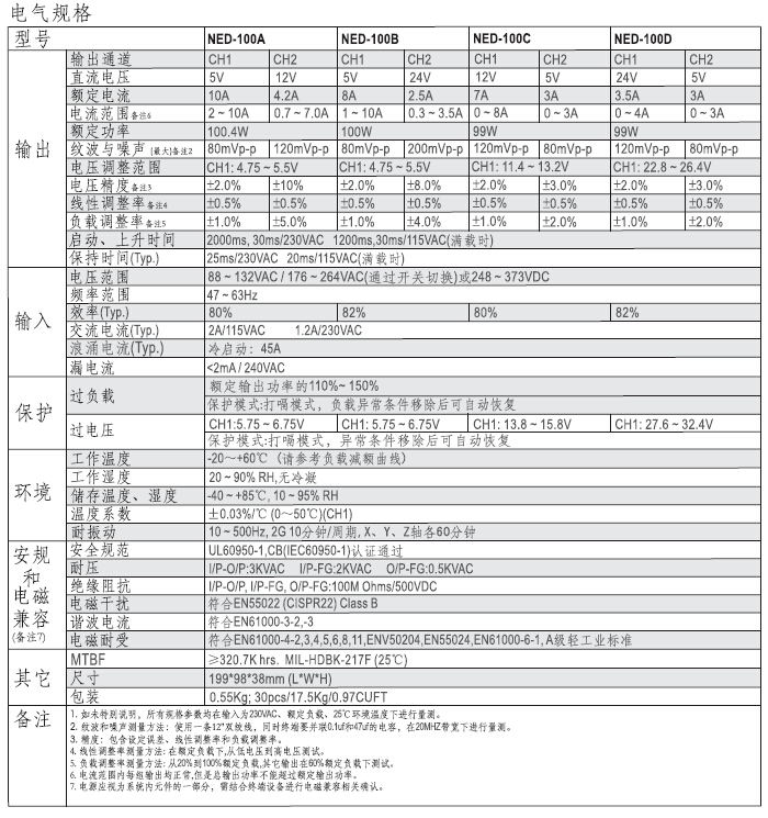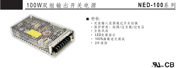 交流输入范围通过开关切换;保护种类:短路/过负载/过电压;自然风冷;LED电源指示;100%满载老化测试;2年保固.