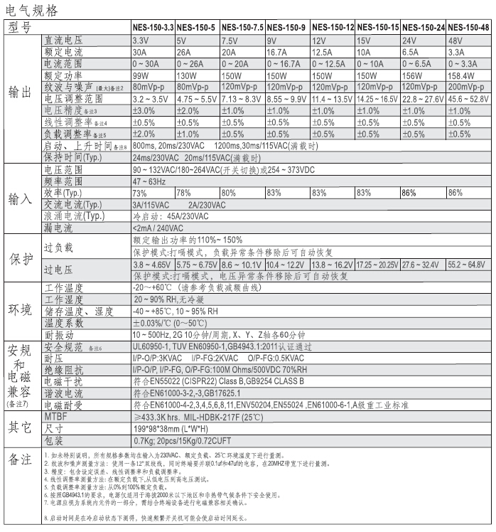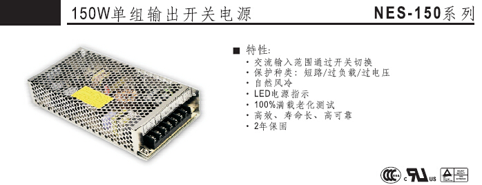 交流输入范围通过开关切换;保护种类:短路/过负载/过电压;自然风冷;LED电源指示;100%满载老化测试;高效、寿命长、高可靠;2年保固。