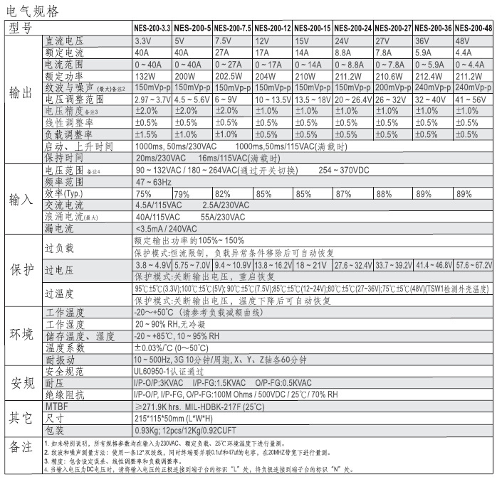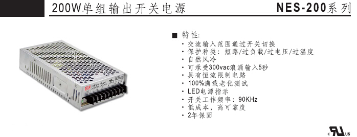 交流输入范围通过开关切换 ;保护种类:短路/过负载/过电压/过温度;自然风冷;可承受300vac浪涌输入5秒;具有恒流限制电路;100%满载老化测试;LED电源指示;开关工作频率:90KHZ;低成本,高可靠度;2年保固.