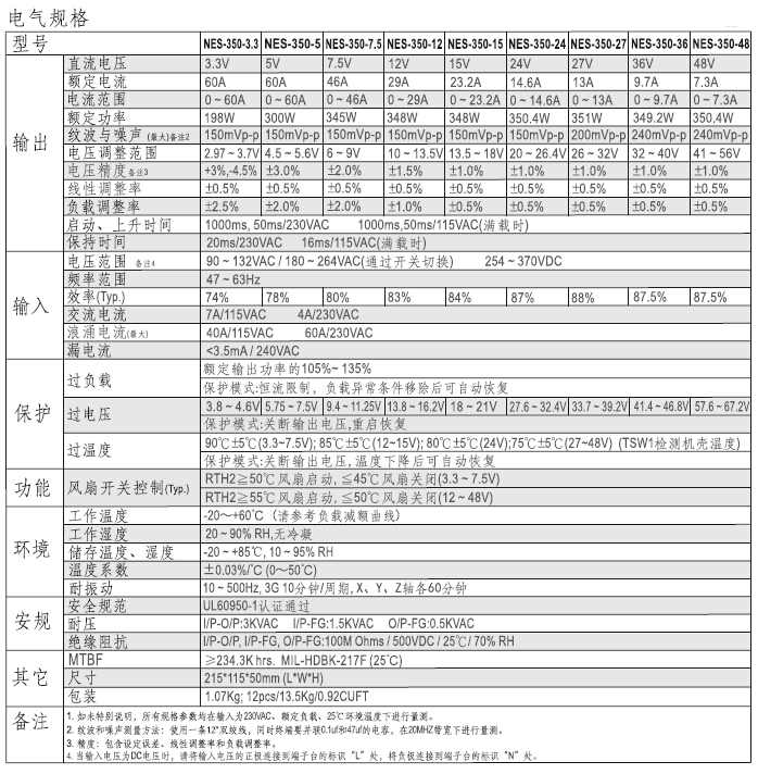 交流输入范围通过开关切换;保护种类:短路/过负载/过电压/过温度;内置直流风扇强制风冷;可承受300vac浪涌输入5秒;具有冷却风扇开关控制;具有恒流限制电路;100%满载老化测试;LED电源指示;开关工作频率:90KHZ;低成本,高可靠度;2年保固。