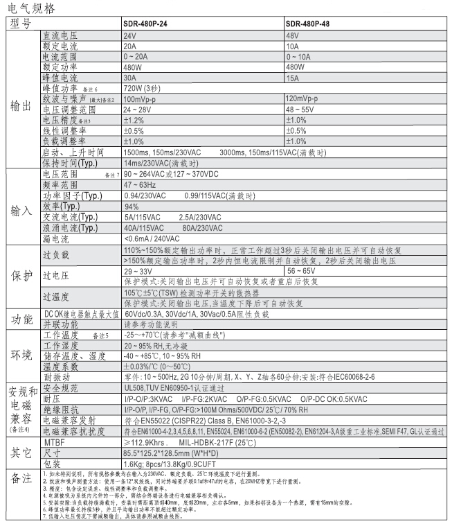 并联功能,高达3840W(7+1);效率高达94%,低损耗;150%高峰负荷能力;内置主动式PFC功能,PF>0.94;保护种类:短路/过负载/过电压/过温度;自然风冷;内置恒电流限制电路;安装轨道:TS-35/7.5 或 TS-35/15;通过UL508 (工业控制设备)认证;EN61000-6-2(EN50082-2)工业耐受等级;内建DC,OK继电器触点;100%满载老化测试;3年保固。