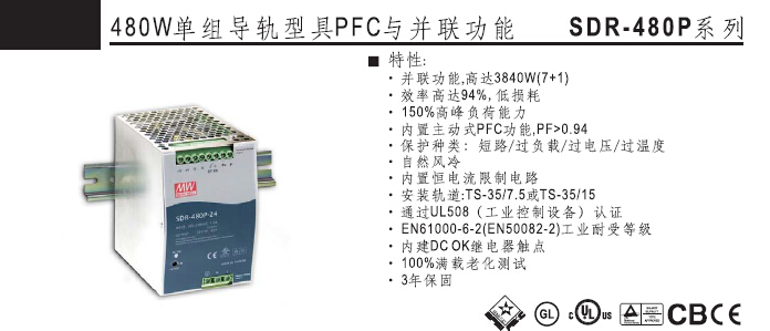 SDR-480P系列 480W单组导轨型具PFC与并联功能