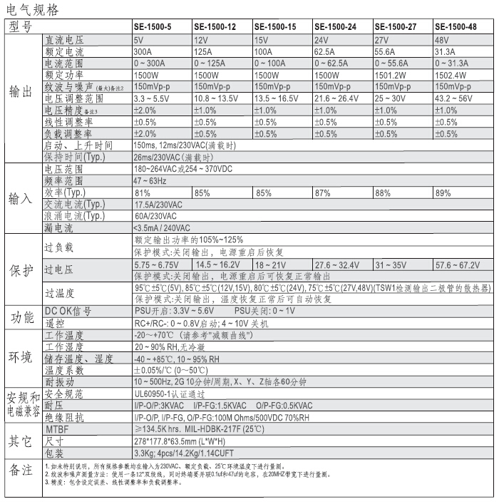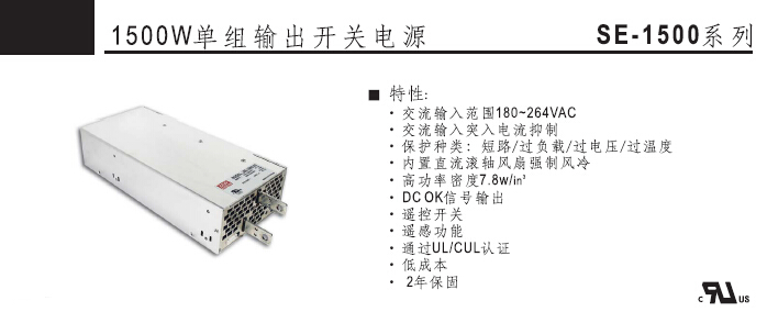 交流输入范围180-264VAC;交流输入突入电流抑制;保护种类:短路/过负载/过电压/过温度;内置直流滚轴风扇强制风冷;高功率密度7.8w/in3;DC OK信号输出;遥控开关;遥感功能;通过UL/CUL认证;低成本;2年保固。