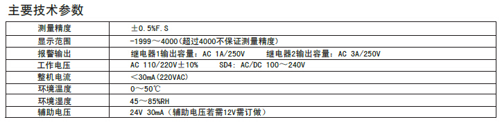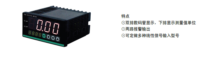 双排数码管显示,下排显示测量值单位;两路报警输出,可定做多种线性信号输入型号。