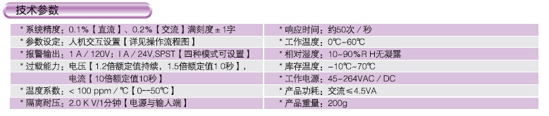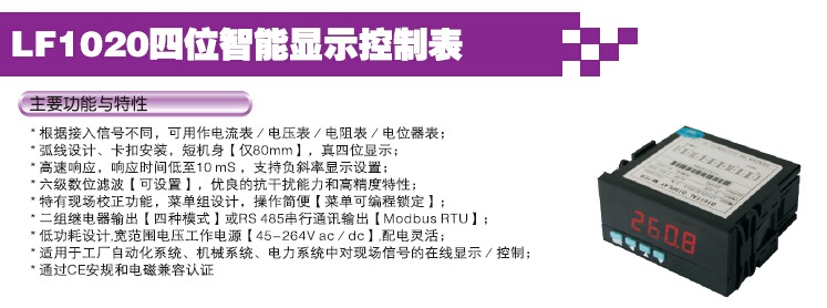 根据接入信号不同,可用作电流表/电JE表/电阻表/电位器表;弧线设计、卡扣安装,短机身【仅80mm】,真四位显示;高速响应,响应时间低至10mS,支持负斜率显示设置;六级数位滤波【可设罝】,二组继电器输出【四种模式】或RS 485串行通讯输出【Modbus RTU】;低功耗设计,宽范围电压工作电源【45-264V ac/dc】,配电灵活;通过CE安规和电磁兼容认证.